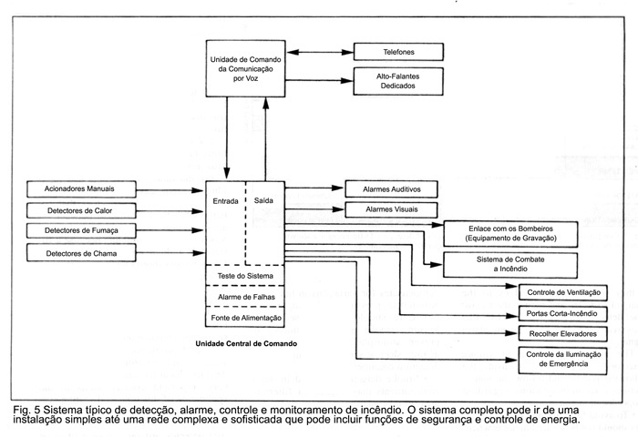em dispositivos de detecção e de alarme e de uma unidade central de controle.
