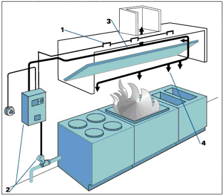 Um esquema de instalação típico de um sistema fixo de proteção para cozinhas pode ser visto na